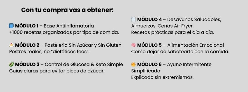Es una guía digital práctica con recetas sin azúcar (ni carbohidratos), simples y sabrosas, pensadas para disfrutar la comida sin culpa ni inflamación, incluso si no sabés cocinar o tenés poco tiempo.